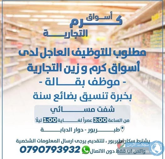 مطلوب موظفين للعمل في اسواق كرم التجارية